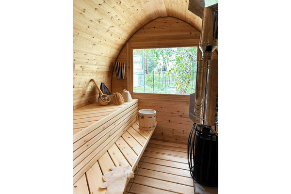 Как и в 4-метровой версии, баня изготовлена из кедрового дерева, которое не только придаёт конструкции долговечность, но и насыщает воздух целебным ароматом. Все элементы интерьера продуманы до мелочей: от стильного освещения до удобного расположения печи и водяного бака.